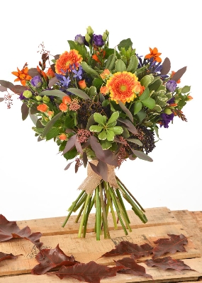 Shades of oranges mixed with tones of blues and mauves and with green foliage for a very natural handtied bouquet.